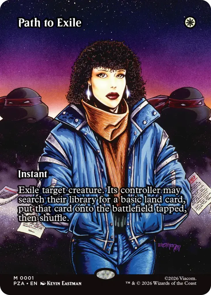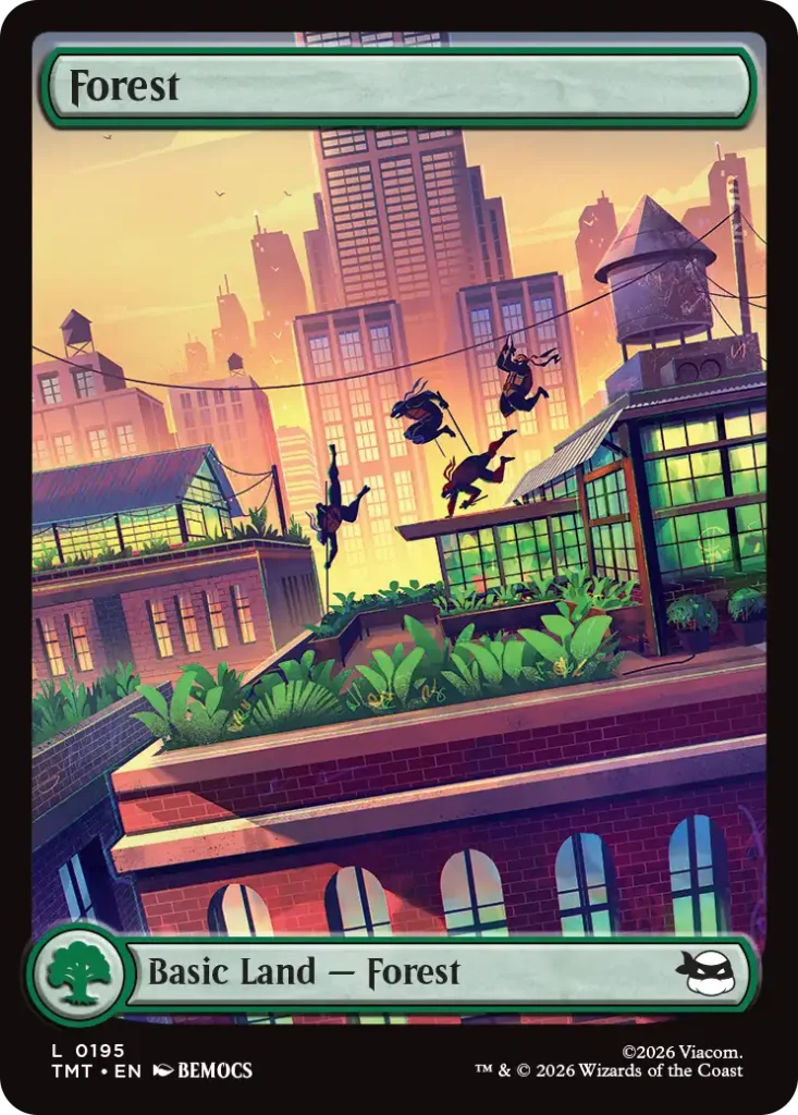 Each of the sets full-art lands showcases the Turtles in action! The Rooftop Basic Lands are pretty iconic if you’re looking for some TMNT vibes to add to your land pool.
