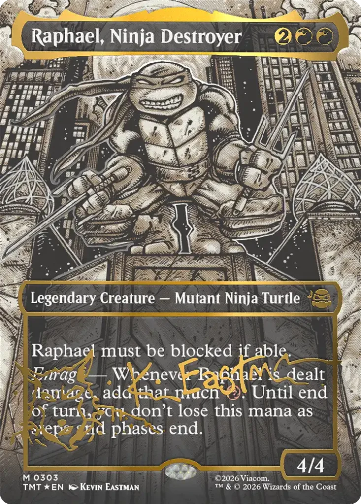 For MTG’s TMNT set it wouldn’t be fair for just one turtle to be a headliner now, would it? Thankfully, the set does feature Leonardo, Donatello, Raphael, and Michelangelo, all in a fitting black and white styling with gold detailing. Each also features a stamped signature from none other than Kevin Eastman, creator of the TMNT comics. These look superb if you are a die-hard Turtles fan!