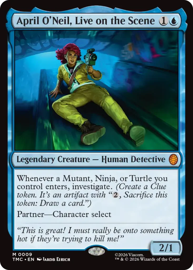 Leonardo, the Balance, is my pick to run the deck out the box thanks to his ability to add counters on all other creatures. The Partner ability also lets you pair up with another of the turtles or even April O’Neil, Live on the Scene, who features the same ability.