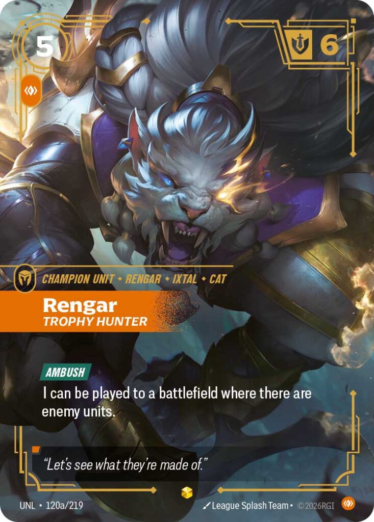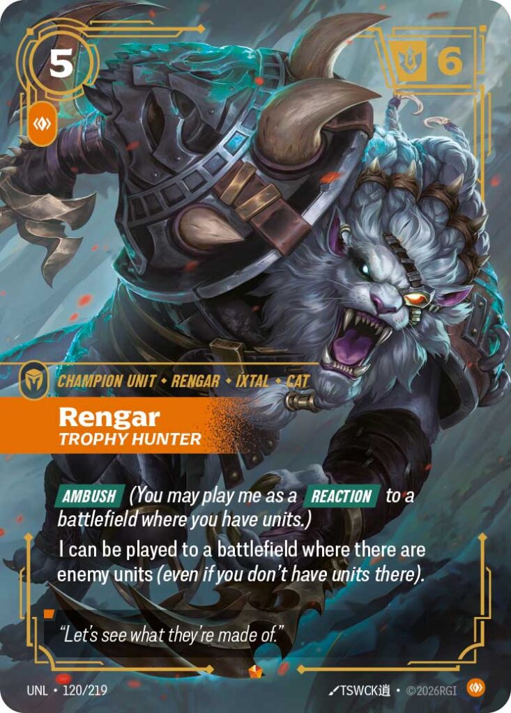 This is your first look at two of the new upcoming cards in Unleashed: Rengar Trophy Hunter in his main art and alt art! Rengar Trophy Hunter is a 5-cost Body Champion Unit with Ambush which allows the card to be played as a Reaction to a battlefield where you have units. Otherwise, the card can also be played directly to a battlefield with an enemy on it, even if you don’t have other units there.